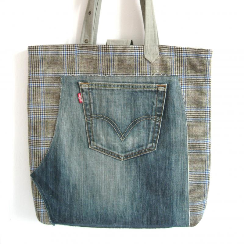 auf der Vorderseite platziert sich ein Stück Hinterhose einer getragenen Jeans auf einem Glencheckkaro in Schurwolle mit Cashmere.Die Rückseite ist aus einem Trenchcoat gefertigt.