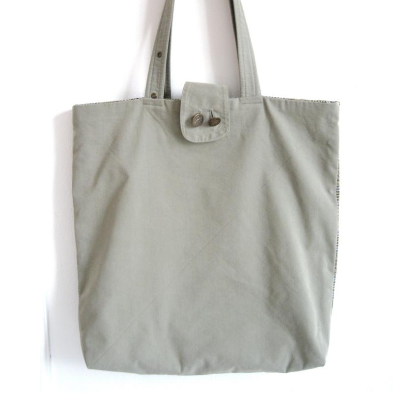 Vorderteil aus braunem Baumwollstoff mit einer kleinen karierten Tasche .Die Rückseite ist auch aus braunem Baumwollstoff mit einer großen Tasche aus Jeansmaterial.