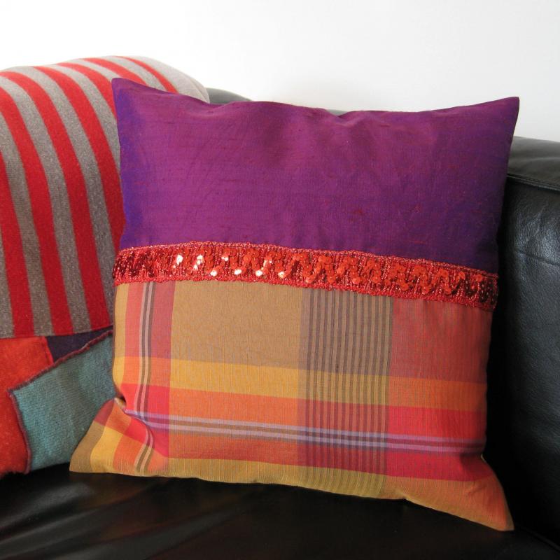 Die Paillettenborte wurde einem Abendkleid aus den 60-ern entnommen, kombiniert mit reiner Seide in violett und einer karierten Acetatseide.