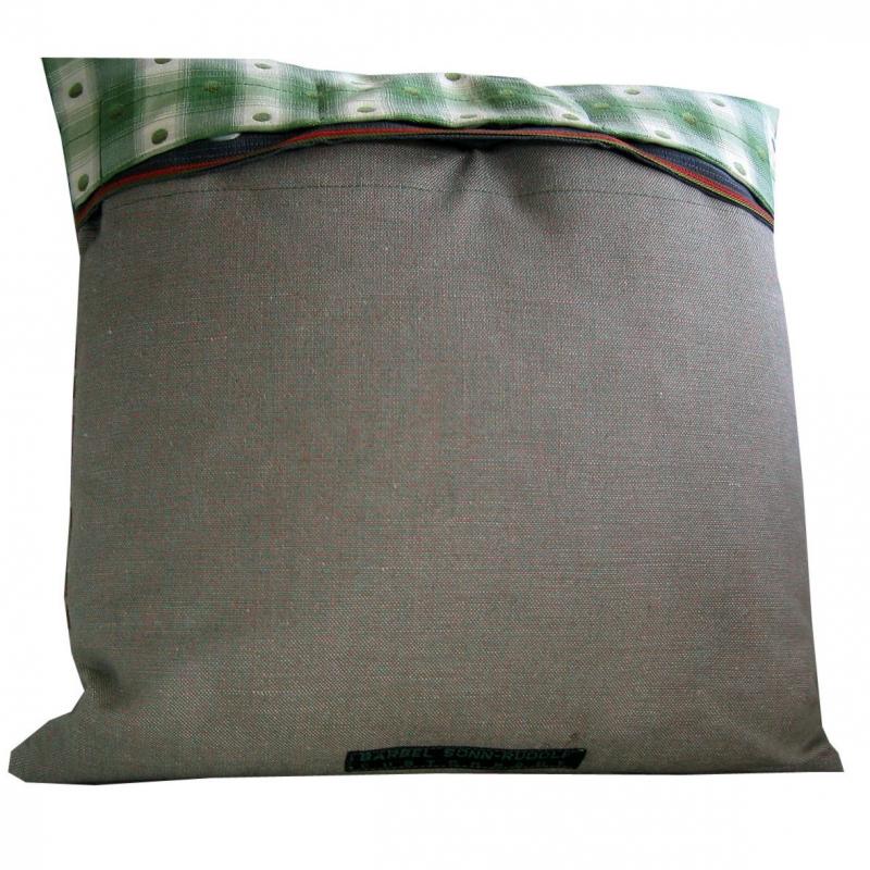 - Bild / Stoffdruck auf Karo-Taft, eingerahmt von grünen Tupfen, die sich harmonisch in den Rasen einfügen.