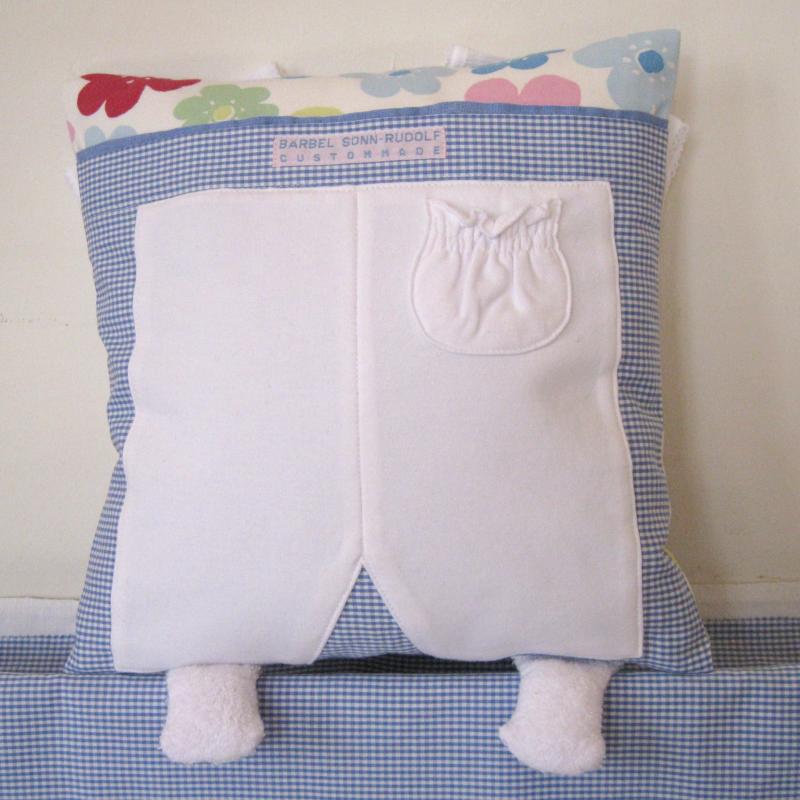Leo’s zu kleingewordene Jogginghose bekommt sein Kuschelkissen übergezogen.