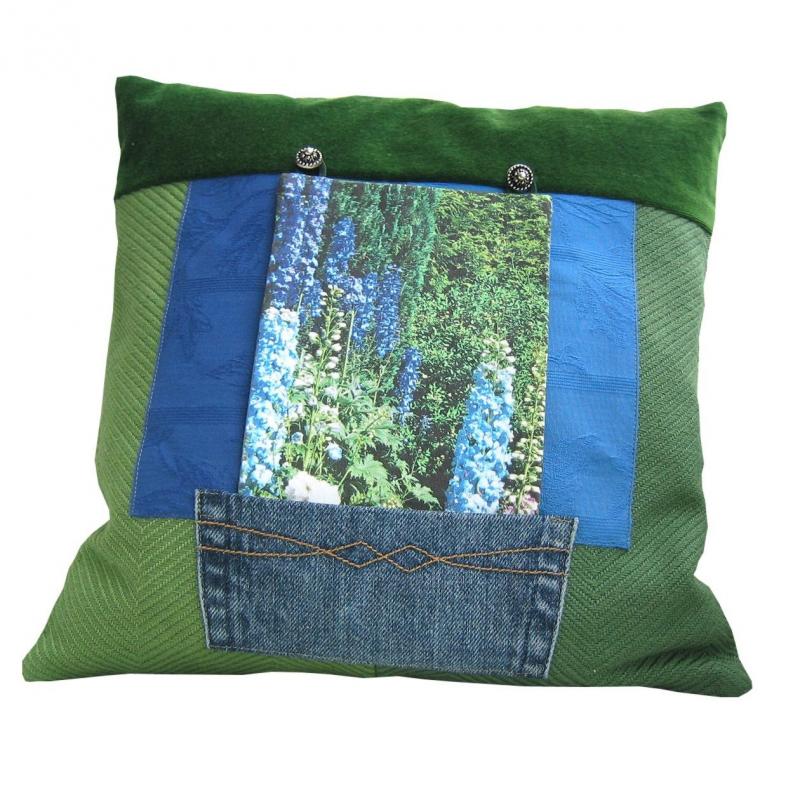 Der Rittersporn aus eigenem Garten steckt in einer ehemaligen Jeanstasche