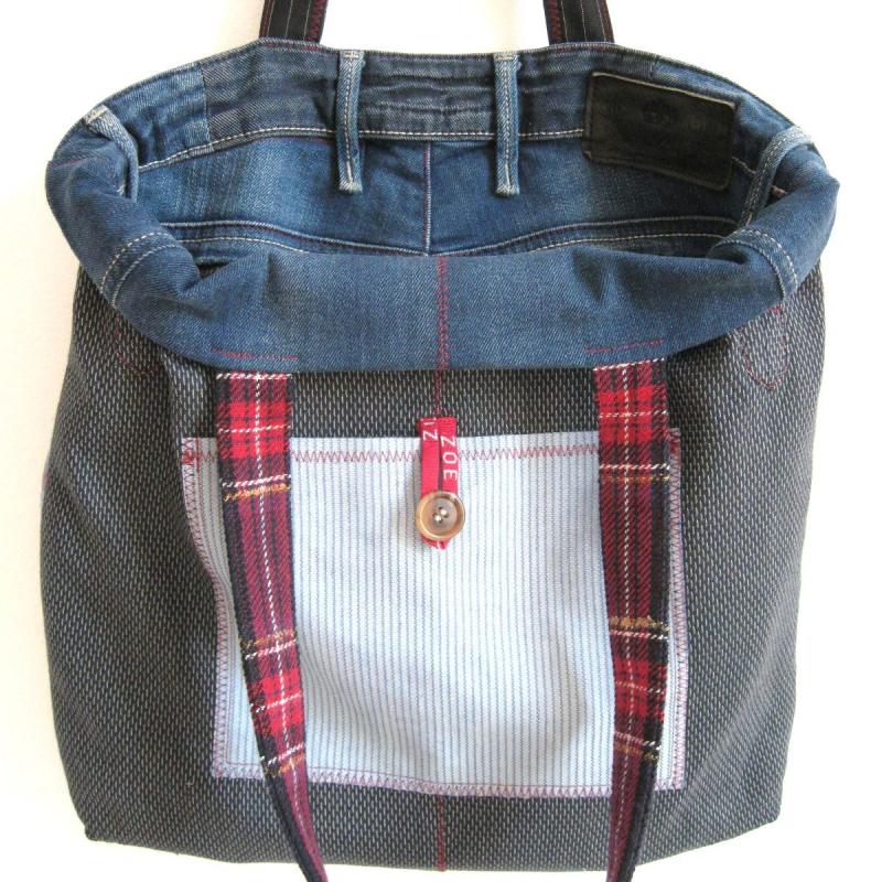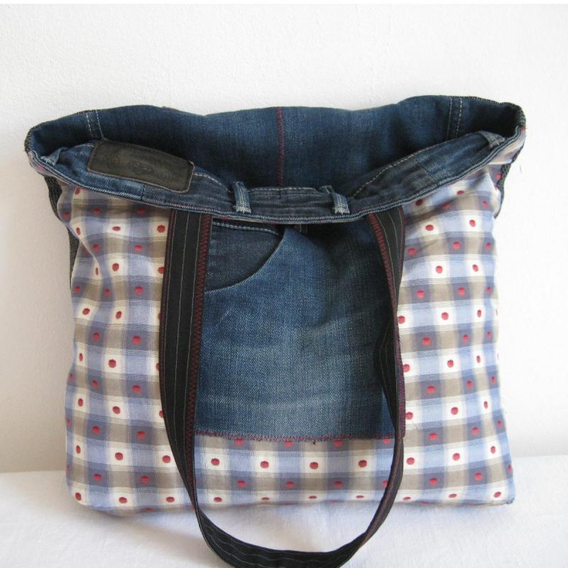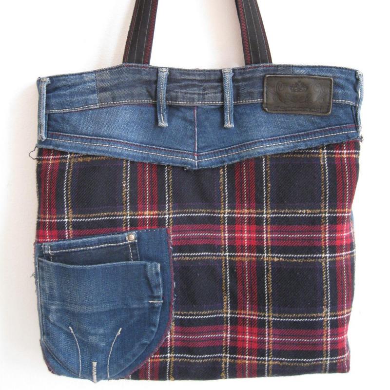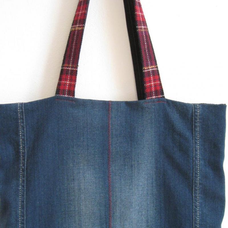 Englisches Wollkaro wurde mit witzigen Jeansteilen kombiniert. Für die Rückseite wurde die Jeans verwendet.