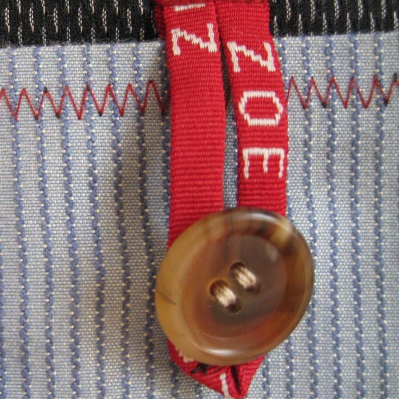 Die Innenseite ziert ein außergewöhnliches Tupfenmaterial mit Jeanstasche , die andere Seite ein schwarzes Herrenhemd mit großer Tasche.
