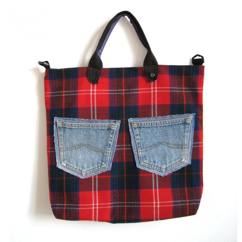Ein ehemaliger Faltenrock im stilechten Tartan wird mit zwei Gesäßtaschen einer Jeans bestückt.