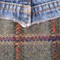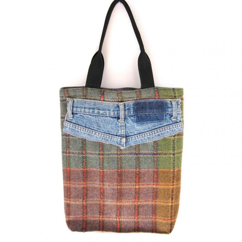 Die rückwärtige Jeanspasse wurde auf ein edles Karo in Grün – und Brauntönen recycelt.Die restliche Jeans bildet das Rückteil der Tasche.