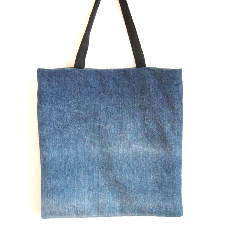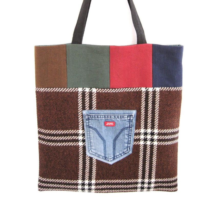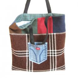Edles italienisches Wollkaro, kombiniert mit Baumwollköperstoffen ,bestückt mit einer Jeanstasche.Die Rückseite ist aus recycelten Jeansteilen.