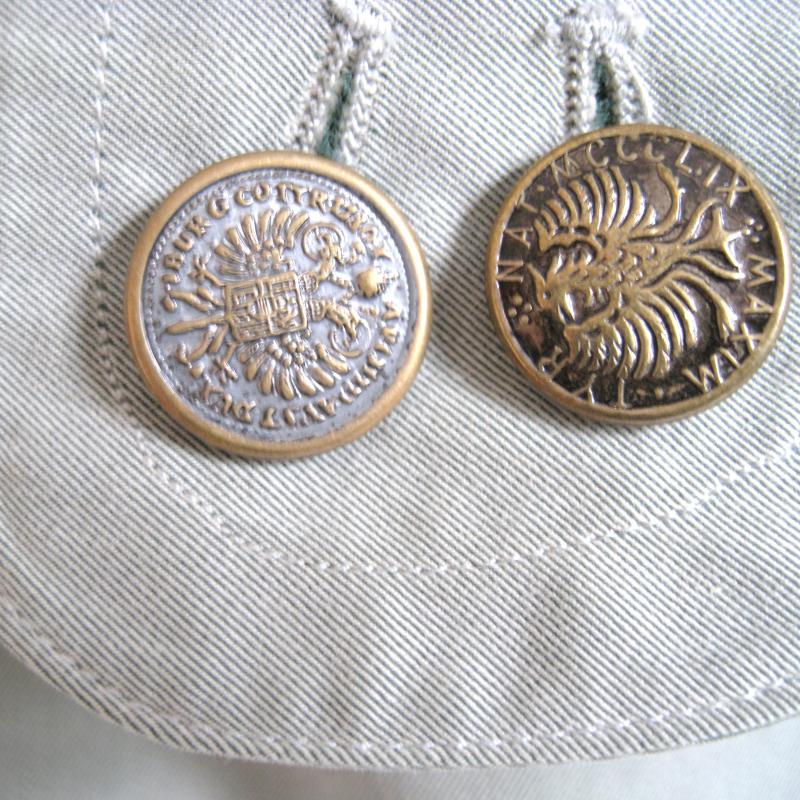 auf der Vorderseite platziert sich ein Stück Hinterhose einer getragenen Jeans auf einem Glencheckkaro in Schurwolle mit Cashmere.Die Rückseite ist aus einem Trenchcoat gefertigt.