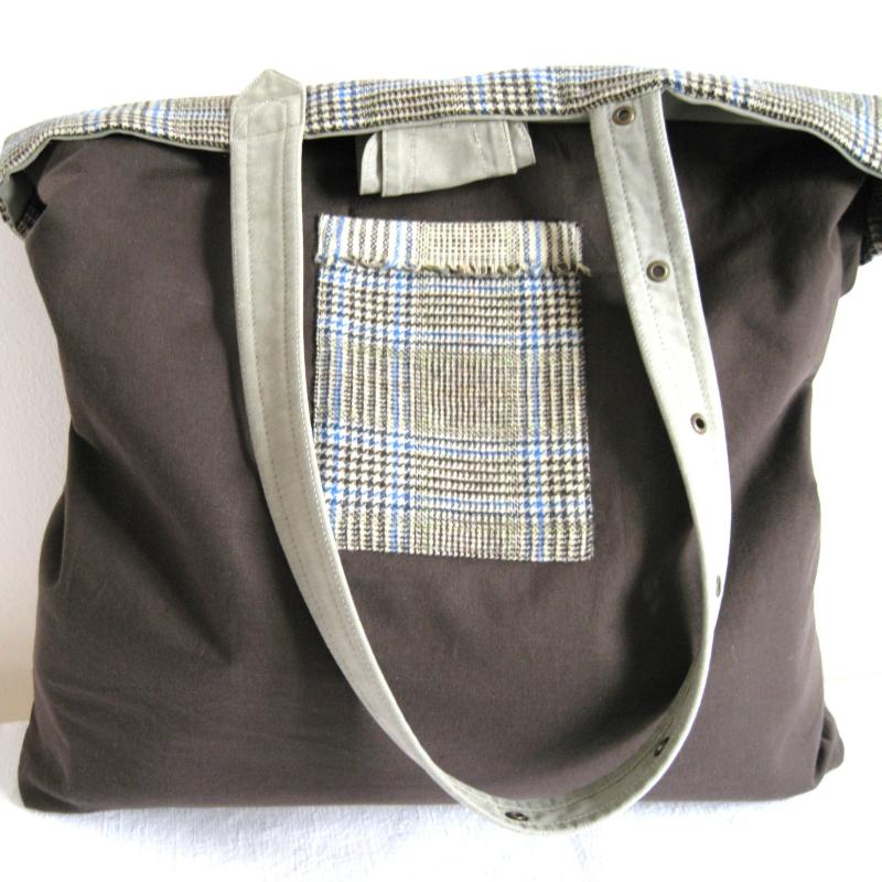 Vorderteil aus braunem Baumwollstoff mit einer kleinen karierten Tasche .Die Rückseite ist auch aus braunem Baumwollstoff mit einer großen Tasche aus Jeansmaterial.