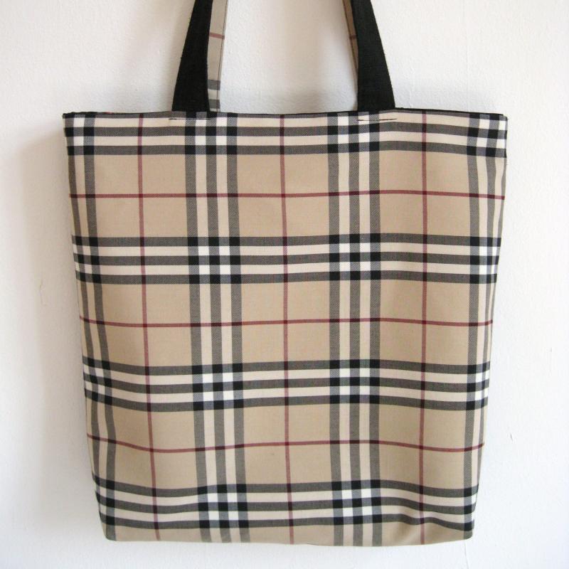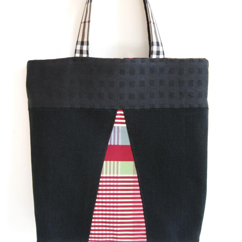 Eine ehemalige Jeans wird mit Streifen veredelt –die Rückseite der Tasche ist ein recycelter Burburry-Rock .