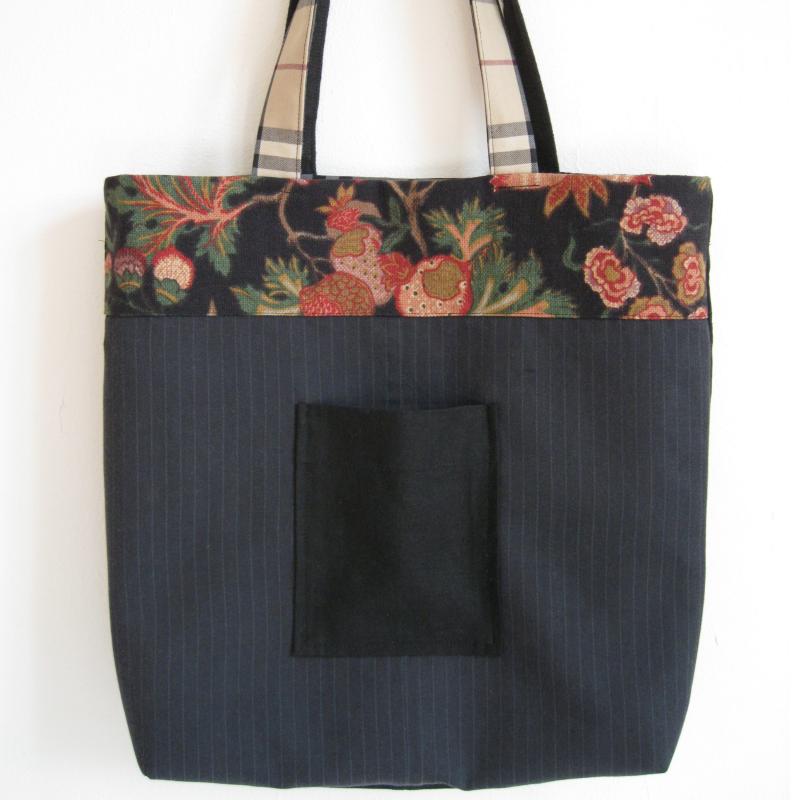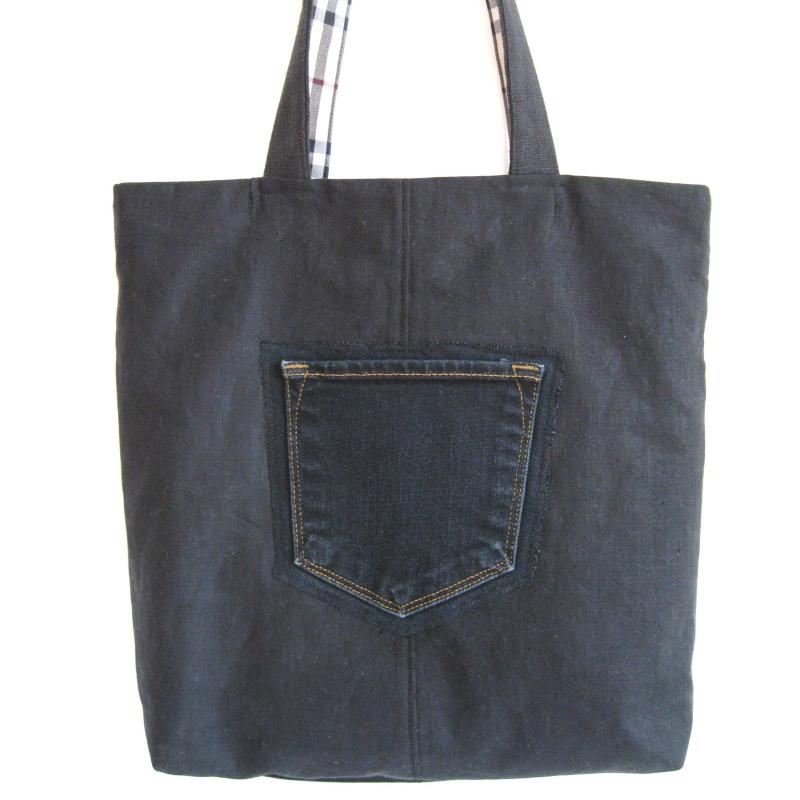 Die Innenseite ist aus einem Herrenhemd und einem schwarzen Leinen. Eine recycelte Jeanstasche , sowie eine Handytasche sind eingearbeitet.