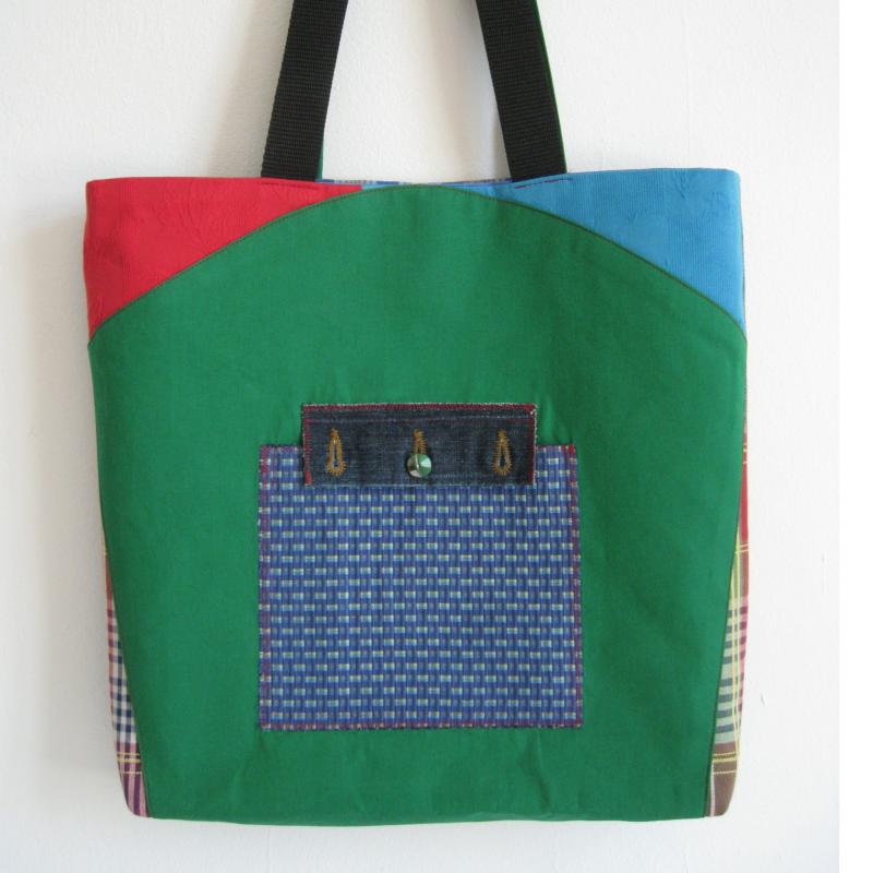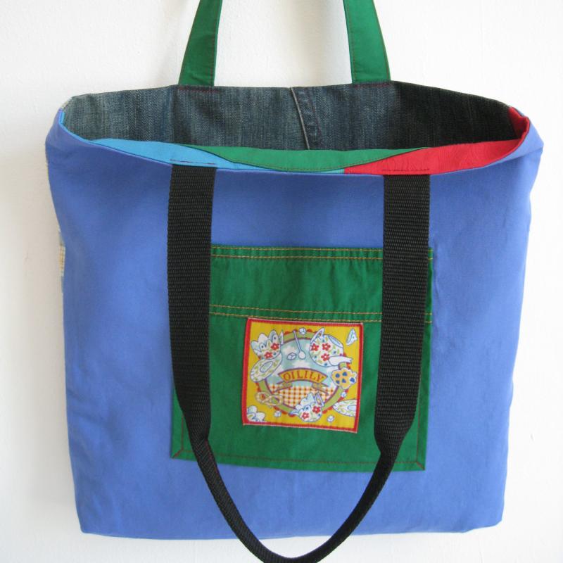Ein Ärmel aus einer Oilily-Jacke aus den 80-ern wurde hier verarbeitet.Knallige „Hingucker“ sind farbige Ecken und die kleine Tasche. Das Rückteil  ist aus einer Jeanshose.