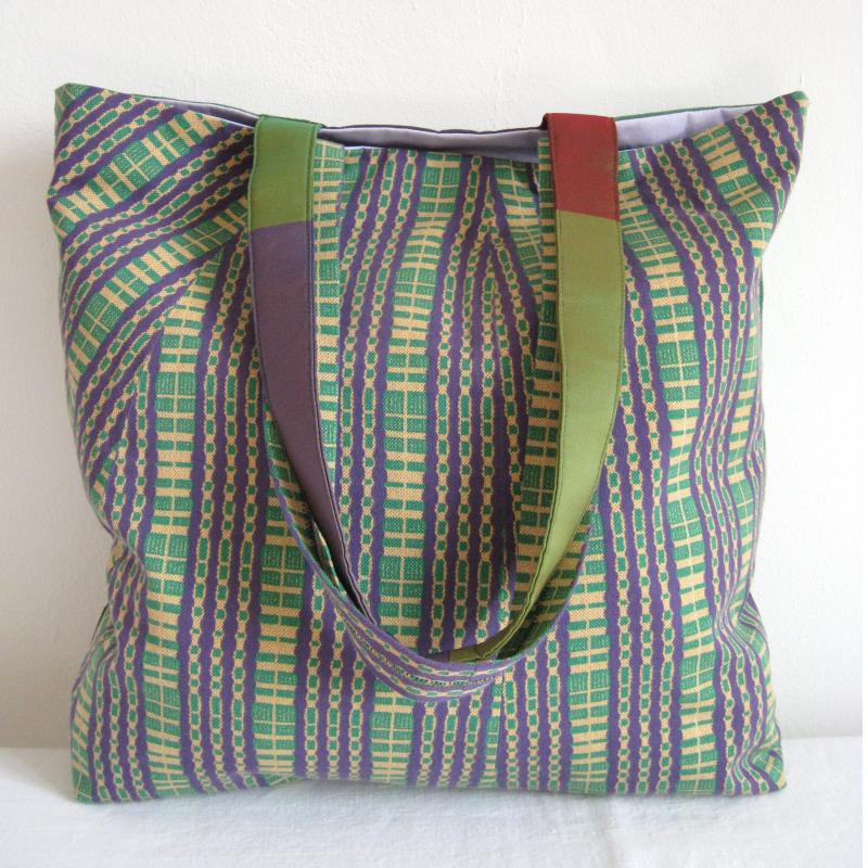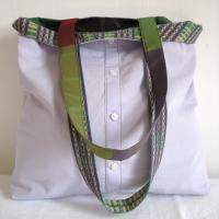 Die Innenseiten sind aus einem Herrenhemd in fliederfarbenem Popeline mit aufgesetzter großer Innentasche.