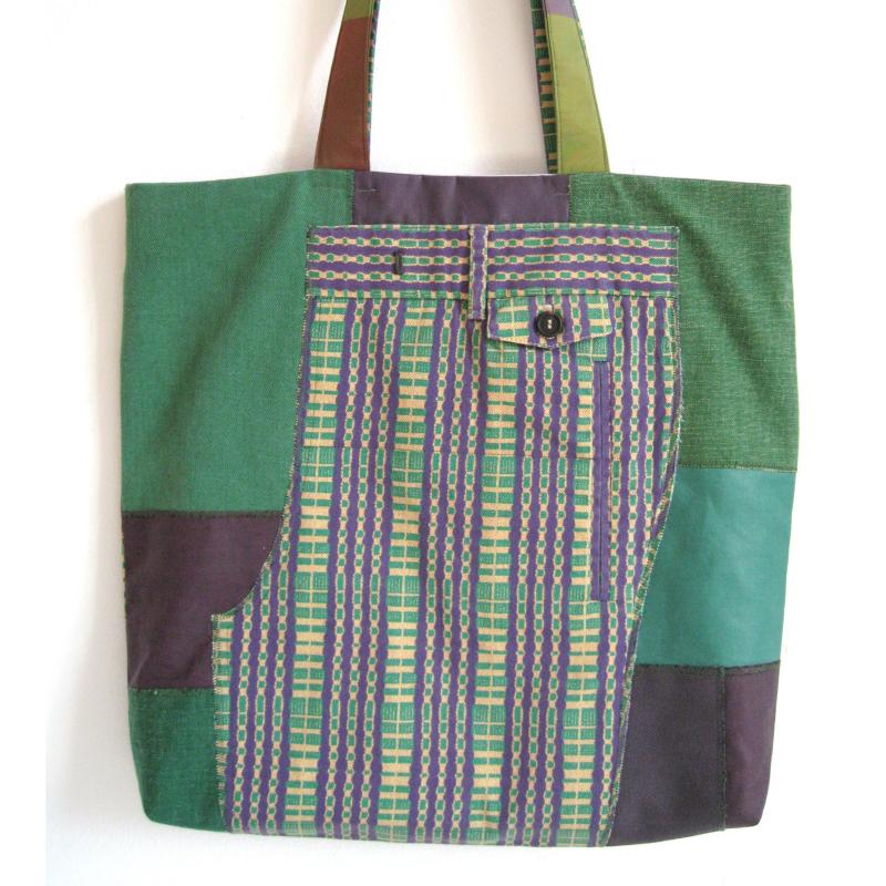 Das Vorderteil ist aus verschiedenen hochwertigen Baumwollmaterialien mit appliziertem Teil einer recycelten Hose, für das Rückteil wurde die restliche Hose recycelt.