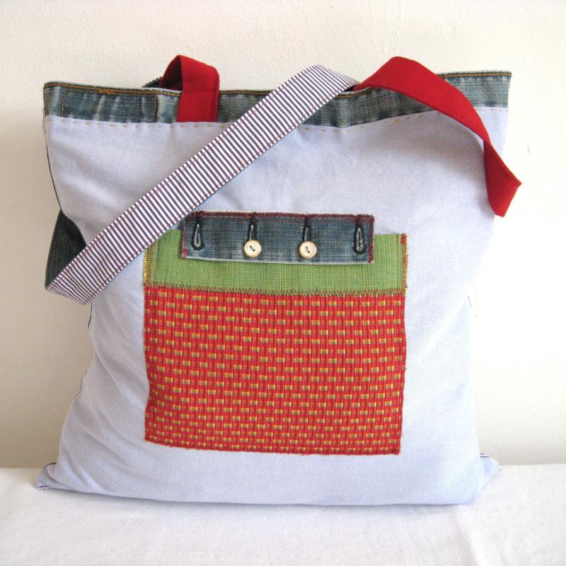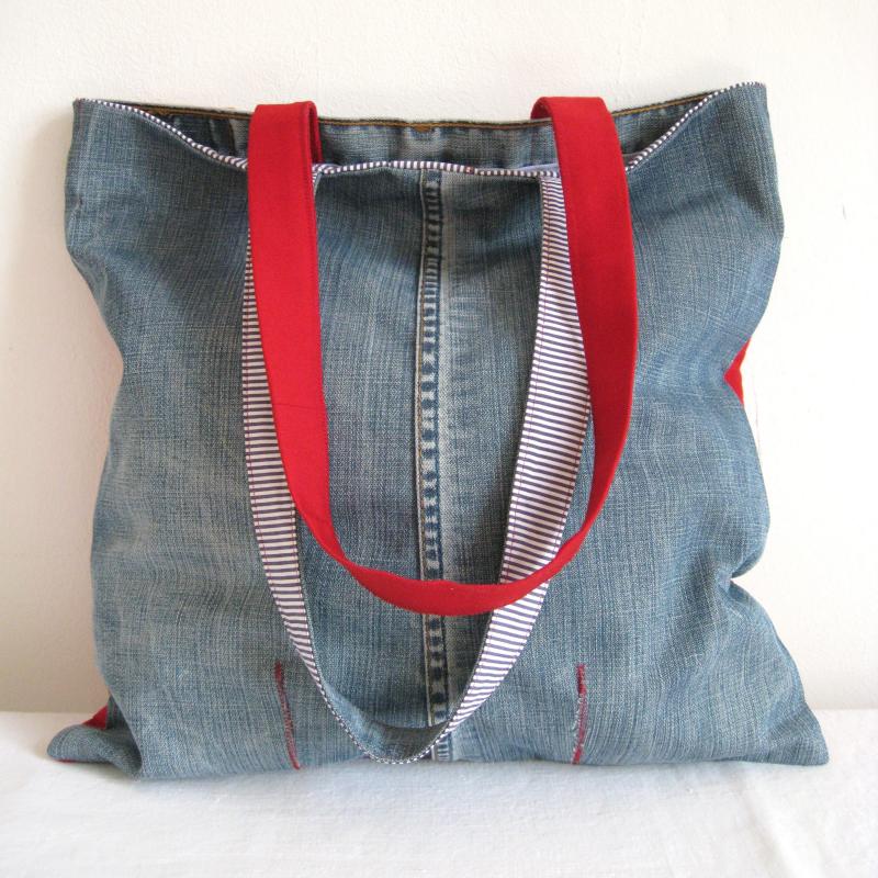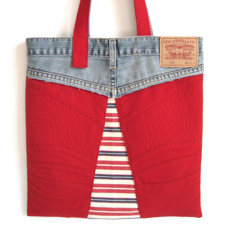 Eine ehemalige Bikerhose in rotem Gabardine trifft eine ebenso recycelte „Levi’s „