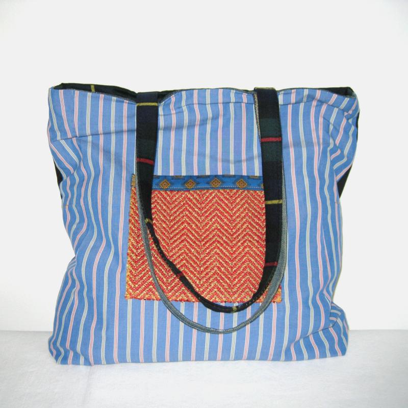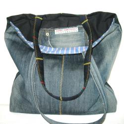 Innenansicht:Vorderseite aus schwarzem Baumwollstoff mit aufgearbeiteter Jeanstasche eines ehemaligen Hosenteils.Die Rückseite ist ein Teil eines gestreiften Herrenhemdes mit einer aufgesetzten Tasche in Fischgratköper.