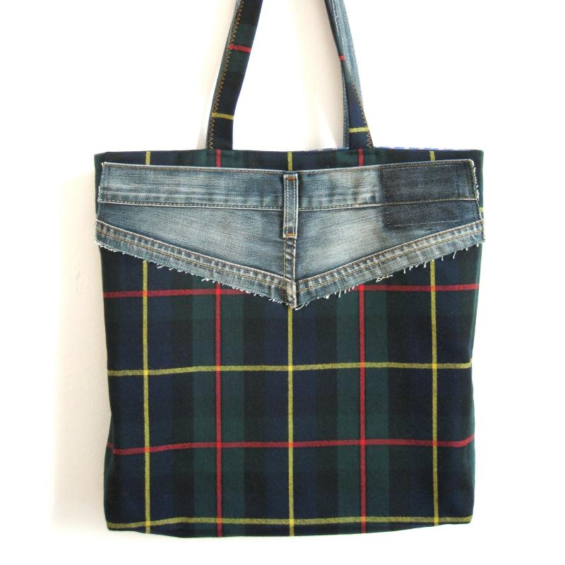 Außenansicht:Die rückwärtige Passe einer ehemaligen Jeans wurde kombiniert mit einem klassischen Schottenkaro in reiner Schurwolle.Die Rückseite besteht aus Jeansteilen der Hose.